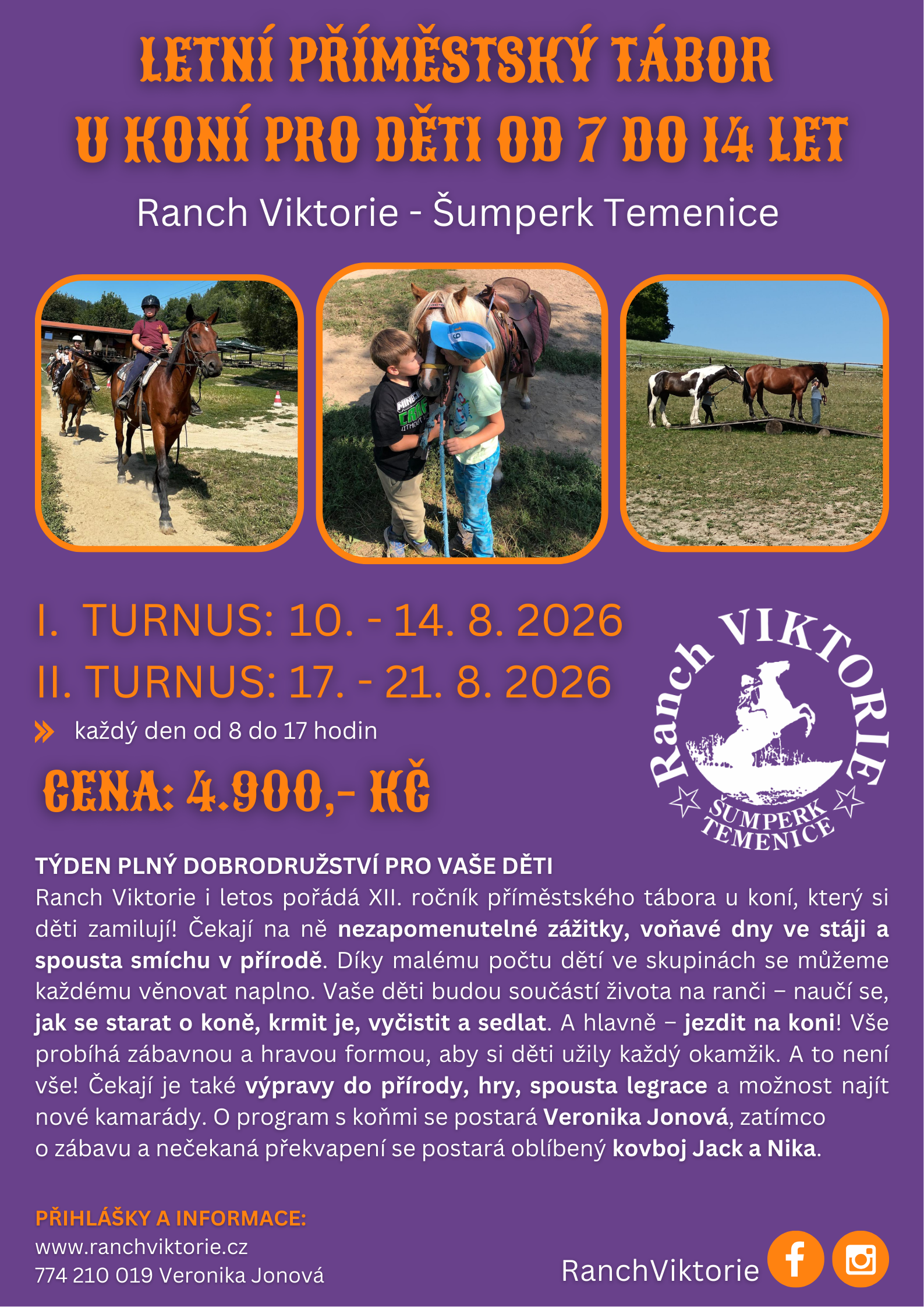 TÝDEN PLNÝ DOBRODRUŽSTVÍ PRO VAŠE DĚTI Ranch Viktorie i letos pořádá XI. ročník příměstského tábora u koní, který si děti zamilují! Čekají na ně nezapomenutelné zážitky, voňavé dny ve stáji a spousta smíchu v přírodě. Díky malému počtu dětí ve skupinách se můžeme každému věnovat naplno. Vaše děti budou součástí života na ranči – naučí se, jak se starat o koně, krmit je, vyčistit a sedlat. A hlavně – jezdit na koni! Vše probíhá zábavnou a hravou formou, aby si děti užily každý okamžik. A to není vše! Čekají je také výpravy do přírody, hry, spousta legrace a možnost najít nové kamarády.